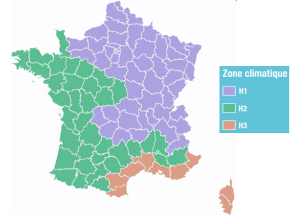 La France hexagonale se compose de trois grandes zones climatiques, définies par leurs températures hivernales. La zone climatique H1 comprend les régions où les hivers sont les plus froids (Île-de-France, Bourgogne-Franche-Comté, Grand Est…). La zone climatique H2 est quant à elle définie par des hivers plus tempérés (Bretagne, Pays de la Loire…). Enfin, la zone climatique H3 est caractérisée par les hivers les plus cléments et comprend les départements méditerranéens (Figure 1, ci-dessous)[1].