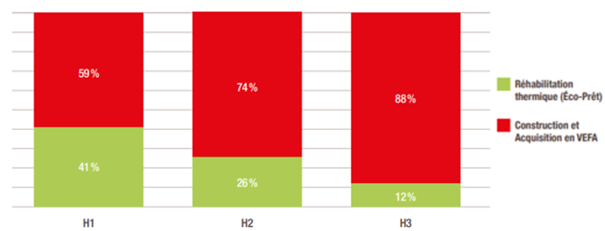 Ainsi, dans les régions Île-de-France, Normandie, Grand Est et Hauts-de-France (H1), entre 30 % et 40 % des rénovations liées à de l’Eco-Prêt ont permis de basculer vers une étiquette A ou B, tandis que dans les régions Nouvelle-Aquitaine, Provence-Alpes-Côte d’Azur et Occitanie (partie sud de H2 et H3), ce sont plus des ¾ des rénovations liées à de l’Eco-Prêt qui ont mené à une étiquette A ou B. L’enjeu en H1 est moins de basculer les étiquettes du parc social vers des niveaux de performance élevés que d’éradiquer les étiquettes énergivores pour ne pas subir de baisse des recettes locatives.
