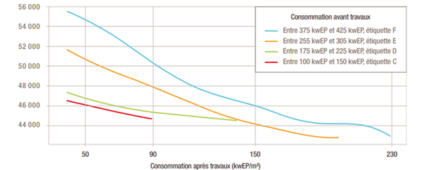 Dans ce graphique, chaque courbe représente le prix de revient modélisé d’une réhabilitation thermique liée à de l’Eco-Prêt en fonction de l’étiquette énergétique de départ. Il montre que chaque kilowattheure d’énergie primaire économisé coûte de plus en plus cher à mesure que l’on bascule vers une étiquette performante (la pente des courbes tend à augmenter lorsque l’on se dirige vers la gauche du graphique). Ce coût marginal augmente d’autant plus que l’étiquette de départ est dégradée. Il y a ainsi des surcoûts propres aux étiquettes les plus dégradées qui peuvent contraindre les bailleurs sociaux dotés d’un parc moins performant, comme ceux localisés dans le nord, l’est et le centre de l’hexagone, à privilégier des rénovations par étape (deux rénovations simples plutôt qu’une seule rénovation ambitieuse), renforçant ainsi le découplage territorial des dynamiques de réhabilitation et de construction de logements sociaux.