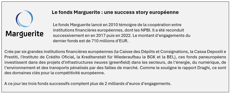 Afin de raviver la compétitivité européenne, le rapport Draghi confère aux banques et institutions financières nationales (NPBIs ou « National promotional banks and institutions » telles que la Caisse des Dépôts), un rôle important, aux côtés de la Banque européenne d’investissement (BEI), au service des politiques conduites par la Commission européenne.