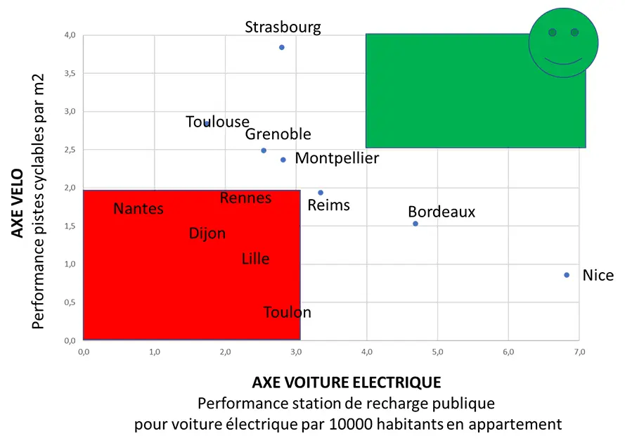Si on positionne les principales villes françaises selon le niveau d’équipement en station de recharge publiques pour les voitures électrique et en pistes cyclables sûres, il apparait des écarts considérables de 1 à 8 pour les stations de recharges entre Nice, le champion français de l’équipement en stations de recharge et Nantes, de 1 à 7 entre Strasbourg, le champion français des pistes cyclables et Toulon.