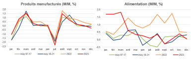 depuis quelques mois, les variations mensuelles de prix sont proches des variations mensuelles historiquement constatées. C’est le cas des biens industriels et, depuis le printemps 2023, des produits alimentaires : il n’y a plus l’anomalie inflationniste constatée en 2022 dans ces secteurs.