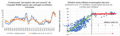 Si l’inflation constatée comptablement est une variable importante pour les forces de rappel de long terme qui intègrent l’inflation dans les équations de comportement des agents, l’évolution des variables indexées à l’inflation (taux du livret A, indice de revalorisation des contrats, des baux…), l’inflation ressentie l’est tout autant : i) c’est elle qui forme l’arbitrage de court terme des agents entre épargne et consommation, et au sein de la consommation, entre familles de biens, ii) c’est elle qui influence l’exigence de revalorisation salariale, donc détermine les couts salariaux unitaires qui en résultent et in fine l’inflation future, et iii) le niveau de bien-être des ménages est aussi une question de ressenti des agents qui dépasse la seule mesure statistique.