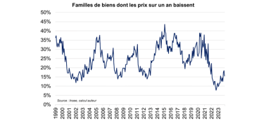 Au total, il apparaît, pour 2024, que la mécanique de désinflation en cours va se poursuivre, notamment dans les secteurs industriel et alimentaire. L’inflation dans les services ne devrait, elle, se normaliser que tardivement dans le cycle (l’effet des hausses de salaires et des prix de l’énergie est à digérer ; le devenir de la productivité du travail est à surveiller). Point d’attention dans l’énergie : où le choc apparaît davantage permanent que transitoire dans le contexte actuel. Y a-t-il des biens dont les prix vont baisser ? Oui, mais ce n’est pas atypique, il y a toujours des biens et services dont les prix baissent : en décembre, 15,5% des 103 familles de biens qui composent l’indice Insee connaissaient des baisses de prix (c’est naturellement, à ce niveau d’inflation, moindre que la moyenne historique de 23%).