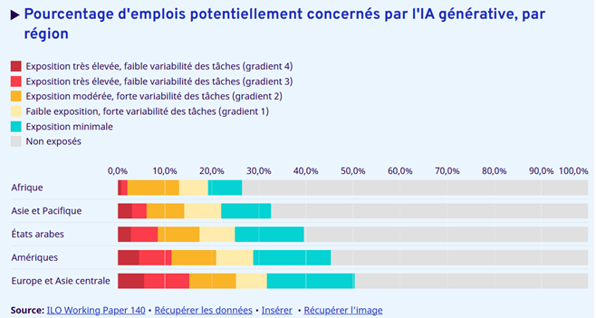 Il est vraiment trop tôt pour tirer des conclusions précises sur les impacts de l’IA. La recherche économique n’est pas assez avancée sur le sujet. A ce stade, l’IA serait un choc technologique plutôt analysé comme un choc d’offre positif permettant des gains de productivité : cela serait un facteur désinflationniste. Il sera toutefois important de voir où se situent ces gains (dans quels pays, dans quels secteurs) et leur répartition (consommateurs de biens et services, producteurs de biens et services ou seulement chez les fournisseurs de solutions IA). Schématiquement, l’équilibre peut aboutir à des prix bas et des taux de profits modérés (règle de partage observée historiquement pour les nouvelles technologies : 2/3 des gains au consommateur et 1/3 au producteur) mais il n’y aura pas des gagnants dans toute la chaîne. Les impacts sur l’emploi pourraient être sensibles : selon l’OIT (source), les pays à revenu élevé enregistrent, avec 34 % des emplois, la part la plus importante d’emplois exposés à l’un des quatre niveaux de vulnérabilité à l’IA.