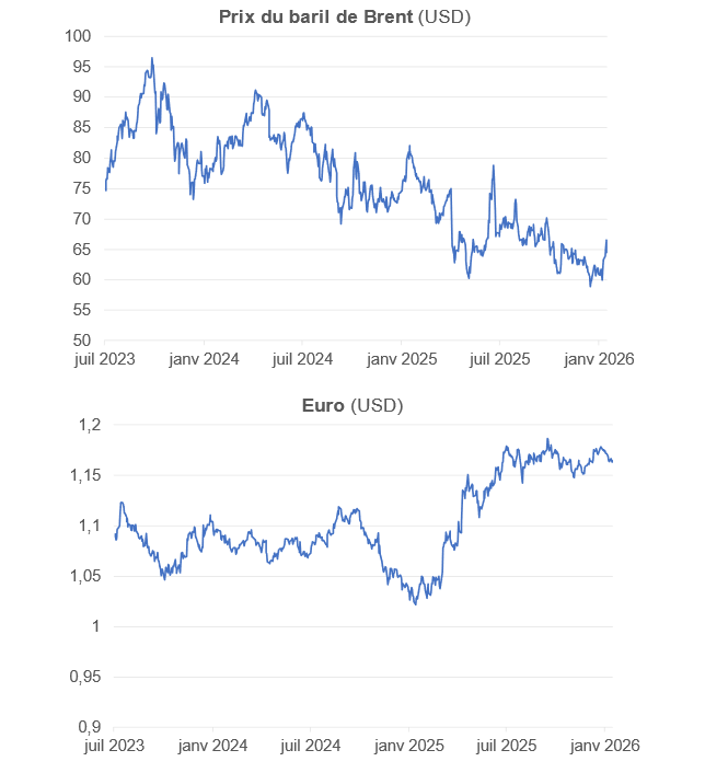 Quid de ces 2 facteurs en 2026 ? Les taux de change et le prix du pétrole sont deux variables qui échappent à la modélisation économétrique prédictive : il est difficile de faire des prévisions avec un degré de conviction élevé (dans les faits, les prévisionnistes retiennent les prix forward, qui ont une réalité financière mais pas de caractère prédictif). Retenons, pour 2026, a) qu’un maintien du dollar et du pétrole aux bas niveaux actuels engendrera mécaniquement une dissipation de la contribution négative à l’inflation des prix énergétiques telle qu’observée en 2025 (l’inflation totale convergerait alors vers 1,5 %), b) qu’il faudrait répéter les variations de 2025 (donc un baril 10 dollars plus bas et un euro 10 % plus haut) pour conserver une contribution négative en 2026 (et donc participer à ce que l’inflation totale reste proche de 1 %). Le risque géopolitique (Iran, Venezuela) est inflationniste à court terme (offre contrainte) mais désinflationniste à long terme.