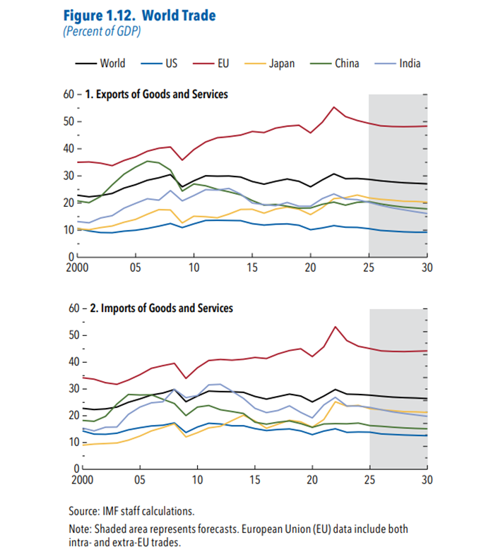 - Il n’y a plus d’accroissements des nouveaux échanges suscités par l’accès à des nouveaux producteurs moins chers tel qu’observé dans les années 2000 : la désinflation importée sera moins forte qu’elle n’a été lors de la période de mondialisation ; le FMI (WEO, octobre 2025) prévoit une stagnation, en % du PIB, du commerce mondial dans les années à venir, en rupture avec la tendance croissante des dernières décennies (graphique ci-après).