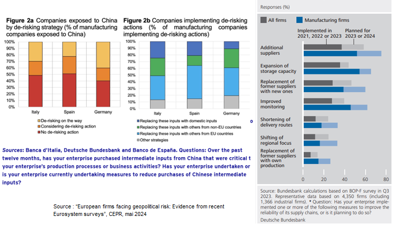 - Face aux risques géopolitiques, les entreprises doivent organiser leur résilience, ce qui se traduit normalement par davantage de stocks qu’auparavant (ce qui a un coût) et davantage de producteurs pour diversifier son exposition à une zone, plutôt que de concentrer son approvisionnement chez le fournisseur moins cher (cf. graphique). Ces hausses de coûts de production passeront possiblement dans les prix à la consommation.