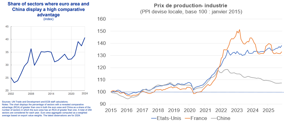 Il apparaît que la Chine continue à monter en gamme technologiquement : sur 259 secteurs, la part des secteurs dans lesquels les produits chinois sont en concurrence directe avec les produits européens est passée de 25 % à 40 % entre 2002 et 2024 (note : relativement aux produits américains, la part est restée faible et proche de 10 %, tout en reculant). Les coûts de production des biens industriels ont beaucoup augmenté en zone euro (choc énergétique lié à la guerre), pas en Chine. Il y a là deux effets désinflationnistes :