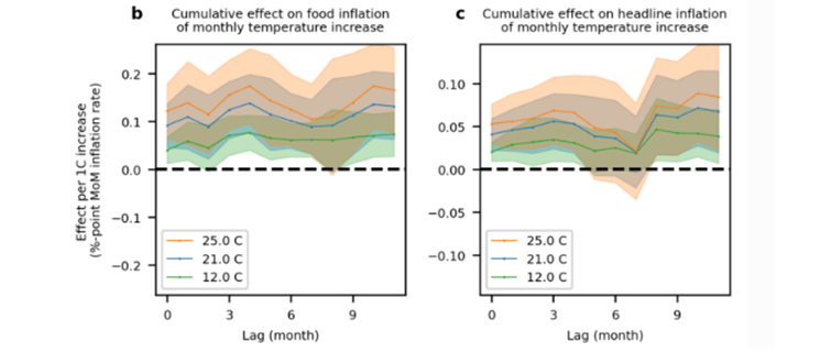 Le réchauffement climatique engendre des contraintes d’offre, avec des contraintes de production (arrêt de la production, renchérissement des coûts de production) et des rendements agricoles moindres : les coûts de production augmentent, entraînant les prix à la consommation. Ces effets sont non linéaires (1 degré de plus partant de 25 degrés et plus pénalisant que partant de 12 degrés). Des chercheurs ont analysé 27000 observations de prix et de température entre 1996 et 2021 dans le monde, démontrant les effets du réchauffement climatique sur les prix (Global warming and heat extremes to enhance inflationary pressures, Kotz, M., Kuik, F., Lis, E. et al. Commun Earth Environ 5, 116 (2024)).