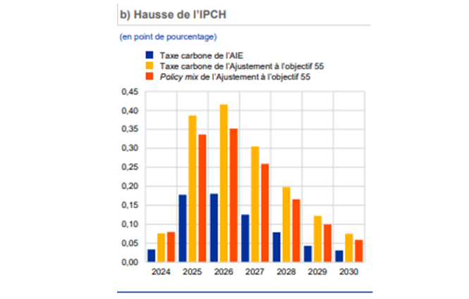 Les politiques économiques, pour atteindre les objectifs de réduction des émissions carbone, peuvent imposer une hausse des taxes carbone (hausse du prix du carbone à 140 eur/tonne dans le scénario AIE, 225 dans le scénario FF55 et 180 dans le scénario policy mix FF55 : cf. « Évaluer les effets macroéconomiques des politiques de transition en matière de changement climatique », BCE, Bulletin économique 1/2024), ce qui aboutirait à un impact inflationniste pouvant aller jusqu’à 0,4 point de pourcentage.