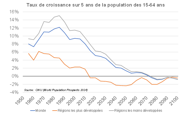 La main-d’œuvre était une denrée abondante dans les décennies passées : la démographie évolue. Le facteur travail va se raréfier, ce qui plaide pour un pouvoir de négociation évoluant vers une moindre modération salariale dans le futur. Selon l’ONU, la population active va voir sa croissance s’amoindrir dans le monde, se contractant même déjà dans les pays développés : c’est un changement de donne par rapport aux décennies passées ;