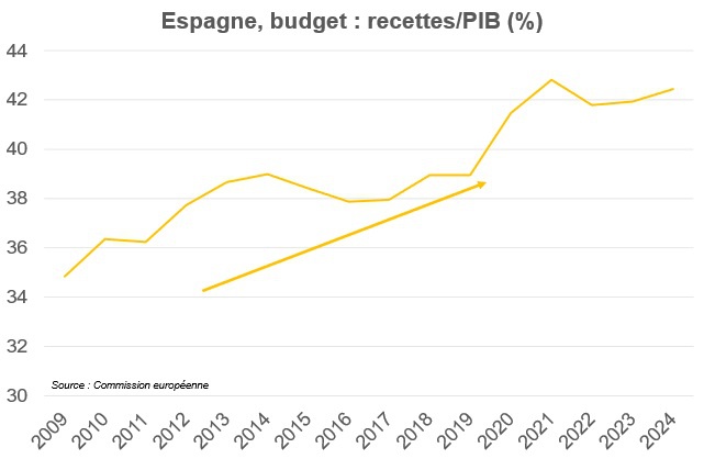 L’Espagne a été concernée par la crise de la dette souveraine, dans le sillage d’une crise des subprimes qui a fragilisé les fondamentaux espagnols. Pénalisé par l’éclatement d’une bulle immobilière, une crise bancaire et un déficit extérieur important, le financement souverain s’est compliqué. Les taux d’intérêt ont sensiblement augmenté : le taux à 10 ans a dépassé 6 % mi-2012. Les notations des agences S&P et Moody’s ont été abaissées de AAA/Aaa début 2009 à un plancher de BBB-/Baa3 courant 2012. Alors, 3 ingrédients ont été mobilisés pour sortir de la crise :