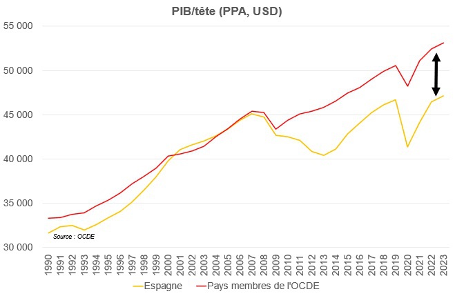 1) Le PIB par tête a décroché : il y a un clair « déclassement » permanent en niveau vis-à-vis des pays de l’OCDE. Le taux de pauvreté relatif a augmenté, contrairement aux pays de l’OCDE.