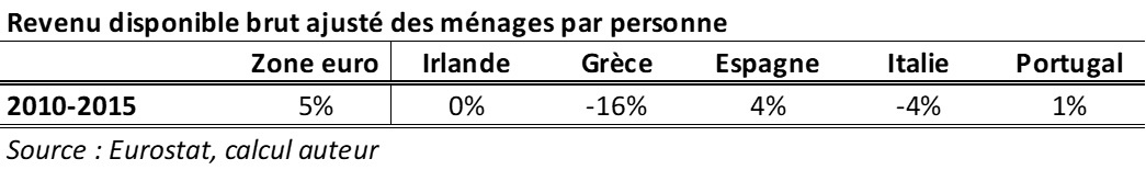 2) Le revenu disponible brut ajusté des ménages par personne, indicateur de pouvoir d’achat, a moins progressé entre 2010 et 2015 dans les pays ayant connu une crise de dette souveraine.