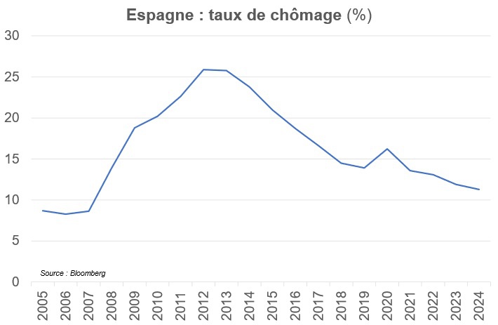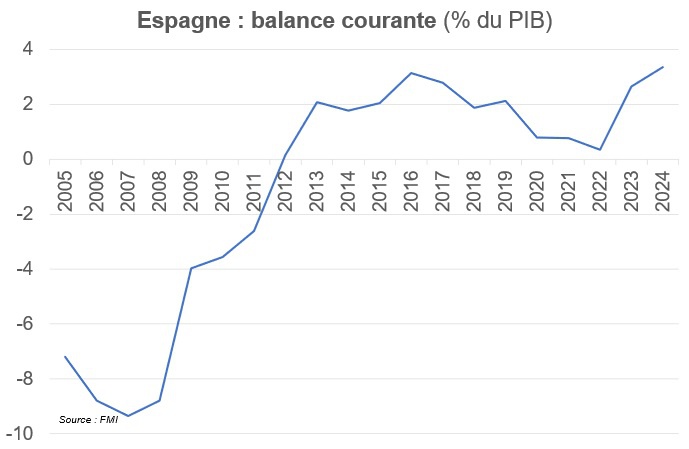 - La notation de l’Espagne s’est améliorée : les notations des agences S&P et Moody’s ont été relevées d’un plancher à BBB-/Baa3 courant 2012 et s’établissent début 2025 à A/Baa1 ;