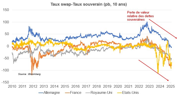 Tout d’abord, signalons que les dettes souveraines connaissent un repricing global et ininterrompu depuis fin 2022 : leur prix, relativement aux autres actifs obligataires (dette d’entreprise, marché des swaps) connaît une dégradation généralisée. Côté demande de capitaux des Etats, les perspectives de croissance de la dette publique dans le futur se sont accrues : en France, la trajectoire Dette/PIB peine à être renversée, en Allemagne, les élections anticipées pourraient aboutir à la fin du dogme du « zéro déficit – minimisation du ratio Dette/PIB », donc se traduire par davantage de recours au marché en 2025 et les années suivantes et aux Etats-Unis, D. Trump a, dans son programme, un plan de relance de 7500 Mds de dollars sur 10 ans, en grande partie financé par le recours au marché. Les besoins de financements sont croissants (vieillissement de la population, réarmement, transition écologique et énergétique, adaptation climatique…). Pendant ce temps, les marchés alternatifs (entreprises) ont des équilibres pluriannuels davantage stables. Côté offre de capitaux, les banques centrales ont poursuivi leur politique de réduction de bilan, réduisant les liquidités en circulation et se traduisant par la disparition d’une grande partie de l’offre de monnaie. Le nouvel équilibre offre/demande se traduit par un accroissement de la prime de terme et par une dévalorisation des obligations souveraines relativement aux taux monétaires (élargissement du « swap spread »).