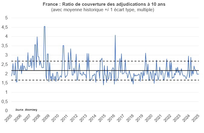 Ensuite, et plus précisément, pour éviter tout amalgame/raccourci, rappelons que la France ne connait pas de crise de la dette. Il y a certes une réappréciation du risque souverain de la part des investisseurs, comme en témoigne l’augmentation de la prime de risque de la France vis-à-vis de l’Allemagne, et de la part des agences de notation (dégradation d’un cran de la notation AA-/AA-/AA3 chez S&P, Fitch et Moody’s en 2024), mais i) la prime de risque reste contenue au regard des niveaux atteints par les primes en cas de crise comme au début des années 2010 et ii) la dette de la France se place plus cher auprès des investisseurs, mais sans rencontrer une moindre demande, comme en témoigne le ratio offre/demande des adjudications qui ne montre pas de décrochage (la demande des investisseurs, lors de l’appel au marché est toujours proche de sa moyenne historique de plus de 2 fois le montant émis).