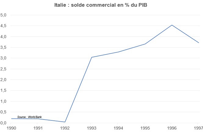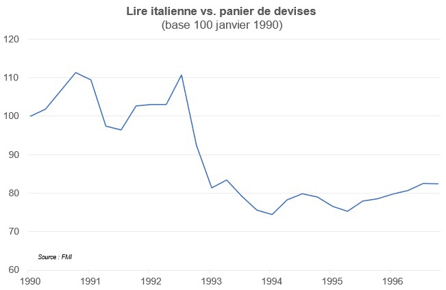Le taux de change permet de faire varier les prix relatifs (prix des biens de ce pays relativement à ceux du reste du monde). On peut rappeler l’exemple de l’Italie dans les années 1990 : la lire italienne a connu une dévaluation de 30 %, entre 1992 et 1996, sortant du système monétaire (SME) qui liait indirectement la lire au mark allemand en septembre 1992 : cela a permis à la péninsule de retrouver de la compétitivité, de redresser sa balance commerciale et de réduire son ratio Dette/PIB. La dévaluation du change a contrecarré les effets récessifs de l’ajustement budgétaire (voir par exemple la Revue de l’OFCE de juillet 2000, la France et l’Italie face à leur destin européen).