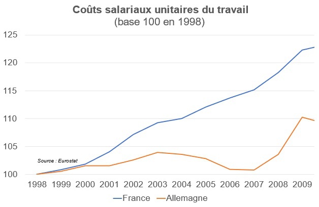 - Une dévaluation « interne ». Pour avoir davantage de revenus, l’économie peut devoir se résoudre à organiser une dévaluation interne. On parle de dévaluation car il s’agit de modifier les prix relatifs (prix des biens du pays domestiques relativement à ceux étrangers) mais l’utilisation du taux de change étant impossible, cet ajustement est « interne » : il passe par le prix (coûts de production, salaires…). Dans les années 2000, l’Allemagne, qui faisait face à une situation compétitive dégradée, a connu une série de chocs d’offre pour agir sur ce prix interne : les réformes structurelles du marché du travail ont produit des effets économiques positifs (amélioration de la balance commerciale, baisse du taux de chômage, cf. Trésor Eco, Réformes Hartz : quels effets sur le marché du travail allemand ?) mais négatif sur la demande interne allemande et pour les partenaires économiques européens (dont la France : moindre demande allemande et perte de parts de marché au bénéfice de l’Allemagne).