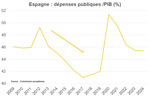 Les finances publiques mondiales sont globalement sous tension. Pour les redresser, il faut procéder de façon graduelle au contraire des erreurs commises dans les plans des années 2010 (aux effets économiques récessifs donc aux conséquences contreproductives sur le ratio Dette/PIB). La croissance doit être préservée grâce à un ajustement progressif. Dans le même temps, il est impératif de raisonner à moyen terme, en liant finances publiques, croissance économique et compétitivité. Il s’agit « aussi » de s’intéresser au dénominateur du ratio Dette/PIB. Dans ce billet tirant les enseignements d’exemples historiques, nous expliquons les mécanismes d’ajustement possibles (dévaluation externe, interne), en rappelant l’expérience espagnole, puisque la prime souveraine française est proche de celle espagnole aujourd’hui en dépit d’une crise de la dette il y a plus de 10 ans. Concernant le ratio Dette/PIB, l’expérience espagnole montre une action tant au numérateur (dépenses publiques, impôts) qu’au dénominateur (croissance, compétitivité) avec des aides exogènes (politique monétaire, plan de relance européen).