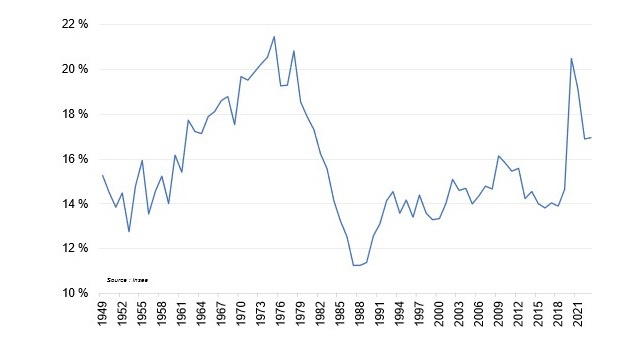 - Entre 1950 et 1975, le taux d’épargne des ménages a augmenté, passant de 14 % du revenu disponible brut des ménages (RDB) à près de 22 % en 1975. À la fin des années 1970, le taux d’épargne recule, sous l’effet de la baisse du revenu réel en période de forte inflation, les ménages puisant dans leur épargne pour maintenir leur niveau de consommation