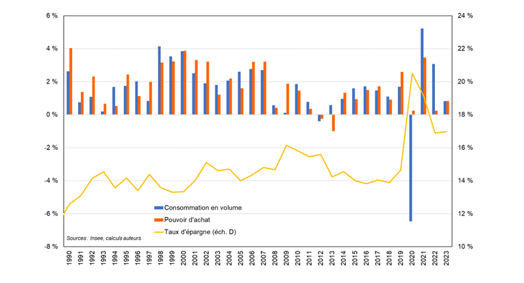 L’évolution du taux d’épargne découle directement de l’évolution de la consommation relativement à celle du pouvoir d’achat (revenu disponible brut déflaté des prix à la consommation, Graphique 2).