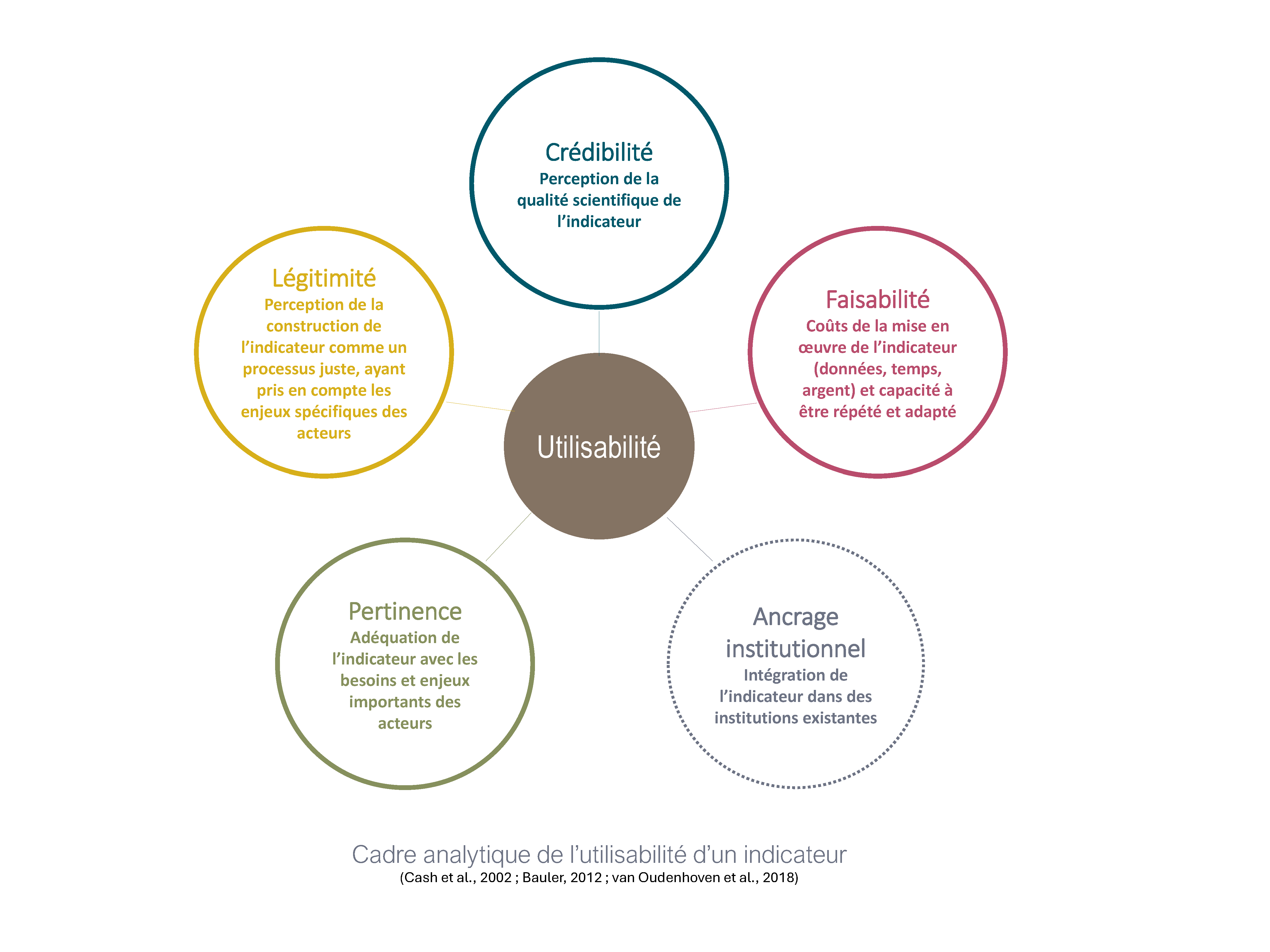 Afin de structurer ces questionnements et identifier les critères prioritaires de choix d’indicateurs, se baser sur un cadre d’utilisabilité devient essentiel. Présenté ci-dessous, il offre des clés pour mieux appréhender les objectifs et critères que s’assigne une organisation. L’utilisabilité étant définie comme le potentiel des indicateurs à être pris en compte par les acteurs dans leurs processus de prises de décisions[5].