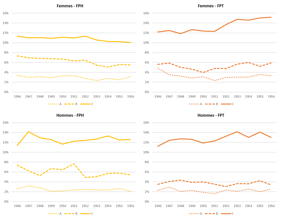 Si l’on privilégie une approche par année de naissance, prise globalement, la prévalence de l’invalidité (i.e. la part d’agents concernés) ne semble pas drastiquement se modifier entre les générations 1946 et 1956. Toutefois l’analyse par sexe, catégorie hiérarchique et versant de la fonction publique laisse apparaître des dynamiques nettement plus contrastées, voire opposées. Dans la Fonction publique hospitalière (FPH), la part des départs en invalidité des femmes recule au fil de ces générations pour toutes les catégories. A l’inverse, chez les femmes de la Fonction publique territoriale (FPT), la prévalence de l’invalidité progresse à partir de la génération 1951, première génération concernée par le décalage de l’AOD induit par la réforme de 2010, en particulier pour les agents de la catégorie C dont la part des départs en invalidité passe de 12,3 % à 15,2 % entre les générations 1951 et 1956. La part des départs en invalidité des hommes augmente également pour ces générations mais de manière beaucoup moins marquée (graphique 2).