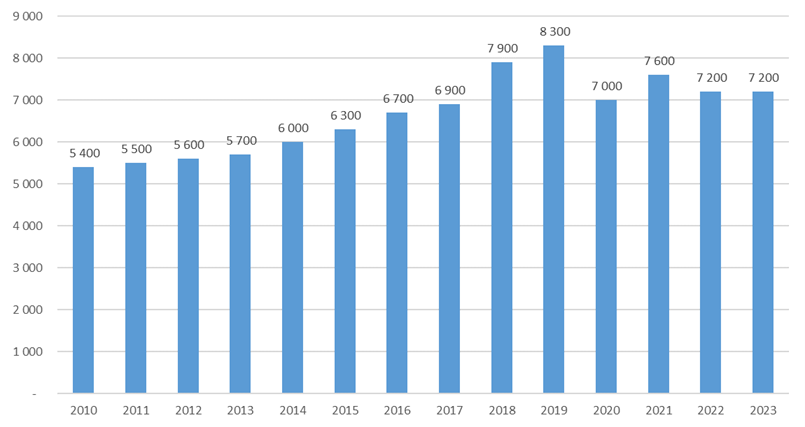 Les flux de départ en invalidité des fonctionnaires territoriaux et hospitaliers, d’environ 5 500 personnes par an au début des années 2010, ont beaucoup augmenté au cours de la décennie jusqu’à atteindre le chiffre de 8 300 départs en 2019, avant de se stabiliser entre 2020 et 2023 à un niveau légèrement supérieur à 7 000 départs par an (graphique 1). Ces évolutions doivent beaucoup à l’augmentation de l’âge moyen des fonctionnaires en activité puisque la probabilité de partir en invalidité augmente sensiblement avec l’âge. Par ailleurs, les réformes successives des retraites, en relevant l’âge d’ouverture des droits (AOD) et en durcissant les conditions d’accès à une retraite à taux plein, ont pu contribuer à générer des départs plus nombreux en invalidité chez les personnes dont l’état de santé ne leur permettait pas de se maintenir plus longtemps en activité.