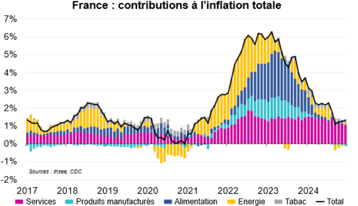 Fin 2024, le seul secteur véritablement inflationniste est celui des services (barres de couleur prune, à 2,2 % en décembre 2024) : c’est classique de voir la queue de la comète inflationniste dans ce secteur. En effet, après un choc inflationniste, s’ensuit une hausse des salaires donc une hausse des coûts de production dans les services (intenses en main-d’œuvre), et in fine, une répercussion sur les prix de vente.