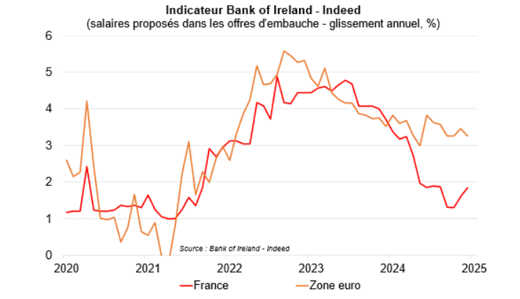 Les fondamentaux conjoncturels présagent d’une dynamique sage des prix en 2025. Le cycle des affaires est grippé, notamment compte tenu d’un manque de visibilité et d’une persistance d’un taux d’épargne élevé. Les stocks de produits finis sont élevés, ce qui est une configuration qui incite les entreprises, pour écouler ces stocks et maintenir la production à un niveau satisfaisant, à contenir autant que possible les prix (amortissement par le taux de marge). De son côté, le marché du travail se détend, les contraintes de recrutement sont moins prégnantes et les salaires sont en ralentissement vers un niveau de milieu de cycle (proche de 2,5 % par an en France, 3 % en zone euro).