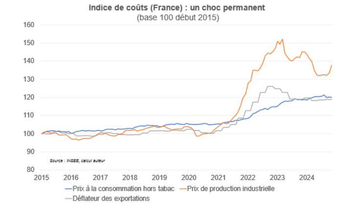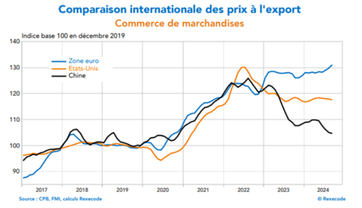 L’inflation s’est normalisée mais il n’y a pas eu d’inflation négative : ces chocs ont donc eu un effet permanent sur le niveau des prix à la consommation, mais également ceux de tous les biens indexés totalement ou partiellement (loyers résidentiels, commerciaux, contrats avec clauses d’indexation automatique, salaires…) et des biens à la production et à l’exportation. Du point de vue de la compétitivité externe, notamment vis-à-vis des régions qui n’ont pas connu ces chocs (Etats-Unis, Chine, Japon…), la zone euro en ressort affaiblie (cf. graphique Rexecode).