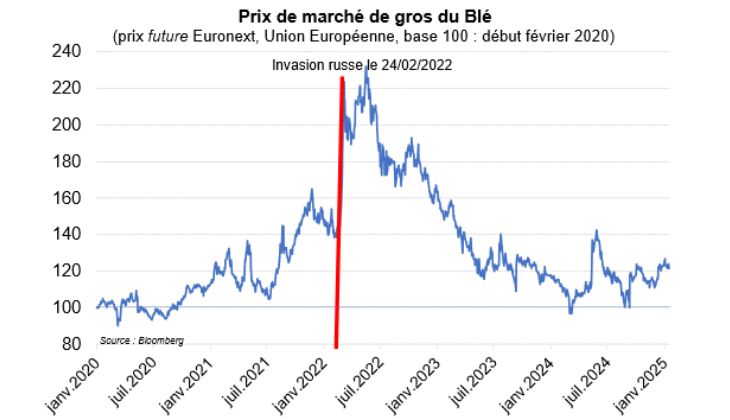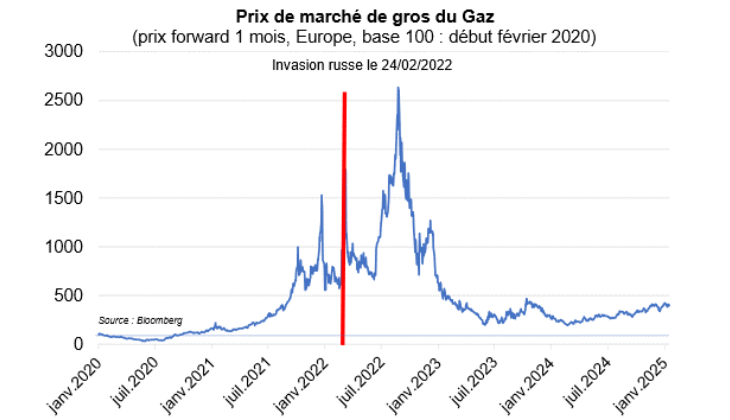 - La guerre en Ukraine se poursuit, mais les circuits de production et sources d’alimentation se sont réorganisés, de sorte que les prix de biens au cœur de la crise ont baissé depuis leur pic, sans être revenus à leurs niveaux d’avant crises (cf. prix de gros du gaz 4 fois plus élevés et du blé 20% plus élevé). Le prix du gaz reste toutefois un sujet à surveiller, surtout dans le contexte de stock assez bas actuellement par rapport à l’an dernier.