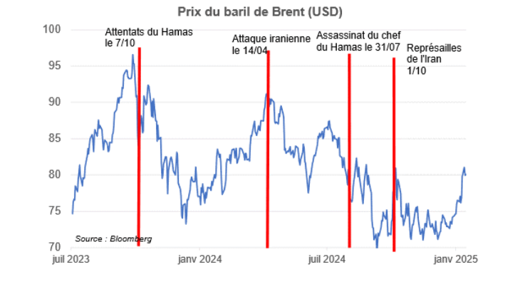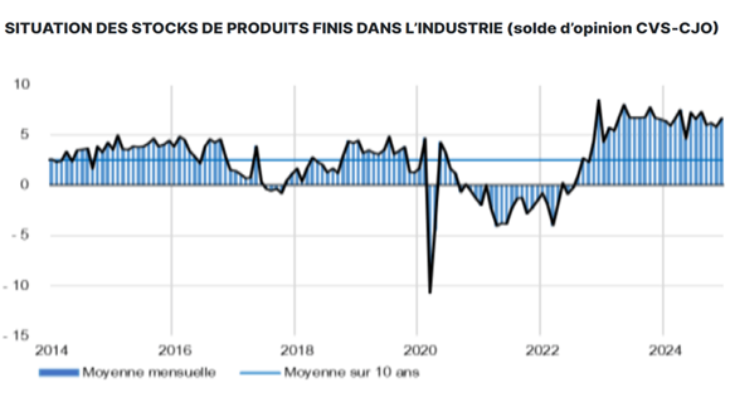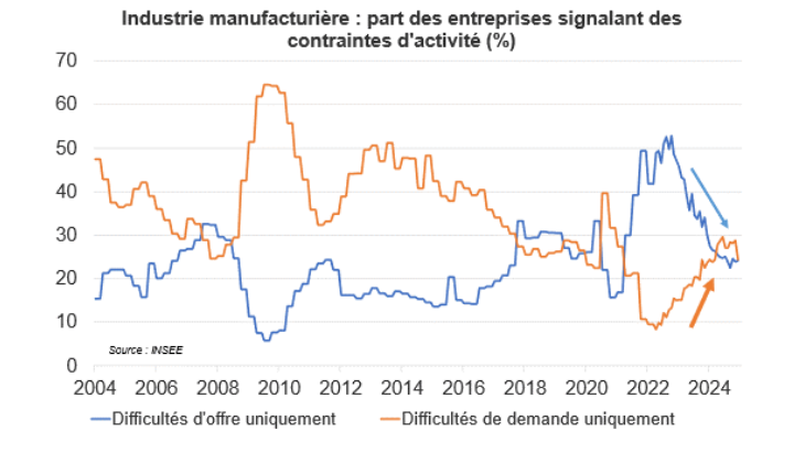 - Le conflit au Proche-Orient et le risque d’escalade au Moyen-Orient ne provoque pas d’inflation, un cessez-le feu ne provoquera pas de désinflation : tout d’abord, le prix du pétrole est resté sage, aidé par une moindre demande chinoise et des perspectives de production-relais en cas de moindre production de l’Iran, ensuite la hausse du prix des transports (le trafic maritime des conteneurs est dévié de la Mer Rouge au profit du Cap de Bonne Espérance) ne mord pas sur les prix finals contrairement aux chocs précédents dans la mesure où les stocks de produits finis sont élevés, ils viennent donc cette fois amortir le choc. Comme témoin des conséquences moindres de ce choc par rapport au choc Covid sur la production mondiale, 24,2 % des entreprises françaises dans l’industrie déclarent rencontrer des contraintes uniquement d’offre selon l’Insee (enquête de décembre 2024), alors que ce niveau culminait à 52 % courant 2022.