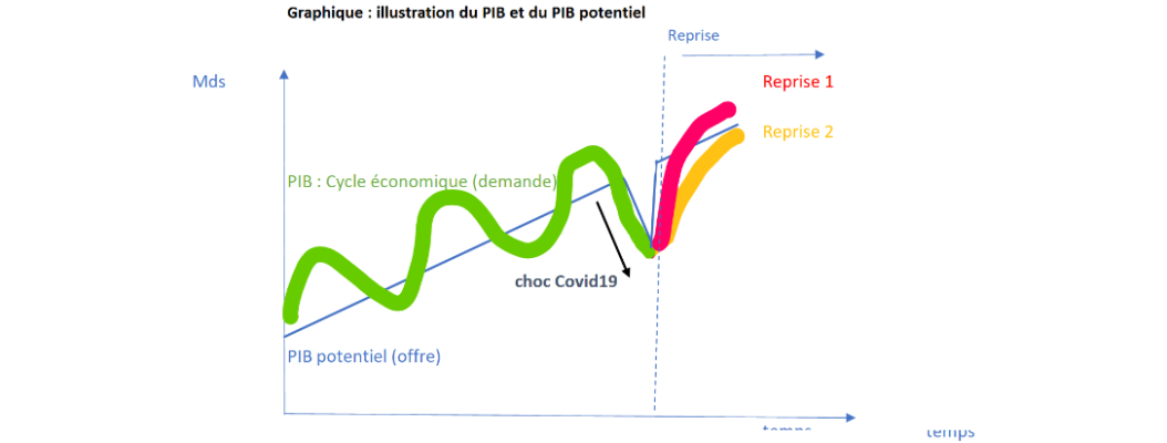 Il faut bien distinguer la France (et la zone euro) des Etats-Unis. Dans les deux zones économiques, la reprise est vigoureuse mais autant aux Etats-Unis la vigueur des plans de relance budgétaires et monétaires propulse l’économie au-dessus de la croissance potentielle (cf. graphique ci-après, reprise 1 = au-dessus de la tendance de long terme en bleu), en zone de surchauffe économique (la demande est très supérieure à l’offre), autant en France la reprise est forte mais ne crée pas les mêmes déséquilibres. Aux Etats-Unis, l’inflation est très élevée (7,0 % sur un an, et encore 5,5 % lorsqu’on exclut les biens énergétiques et alimentaires).