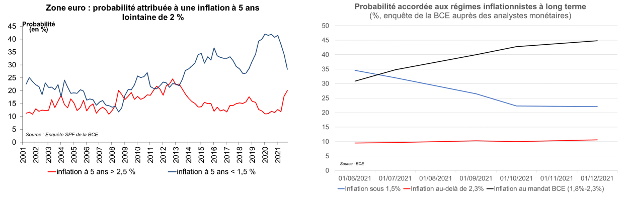 - À moyen-long terme d’autres phénomènes inflationnistes peuvent se manifester : la transition énergétique, la hausse graduelle des coûts salariaux unitaires dans les pays émergents (moindre productivité), la réorganisation des chaînes de production mondiales pour réduire la dépendance aux aléas d’approvisionnement, la démographie (contraction de l’offre de main d’œuvre avec la diminution de la population en âge de travailler dans les pays développés), tout changement du partage de la valeur ajoutée en faveur du facteur travail. Ces phénomènes relèvent de ruptures structurelles : s’ils sont faciles à lister, chiffrer ces phénomènes ou les dater à des fins de prévision (et non de scénario stylisé) est impossible. Toutefois, ils nourrissent la probabilité attribuée à un changement de régime de l’inflation au profit d’un scénario d’inflation durablement plus élevée. Dans les enquêtes de la BCE auprès des spécialistes, la probabilité d’une inflation qui serait en zone euro durablement supérieure à la cible de la BCE (2%) est, selon les sondages entre 10 % (enquête SMA sans grand recul historique) et 20 % (un niveau en hausse récente, mais qui retrouve des niveaux déjà connus). Le choc inflationniste récent facilite, pour les observateurs, la sortie du régime d’inflation basse et lointaine de la cible de la BCE, sans pour autant se traduire par un risque accru d’inflation élevée.