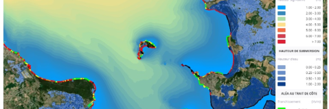 On peut ajouter la submersion marine, et tout ce qui apparaît alors sur l’écran avec la couleur bleue, c’est ce qui apparait si la tempête avait lieu. Donc on peut voir jusqu’où elle s’étend et les territoires ainsi affectés. On voit même la hauteur des vagues. Toutes ces données, on les a regroupées sous le vocable « l’aléa au trait de côte ». Il prend différentes couleurs en fonction du franchissement de la mer qui peut être affecté par la présence – ou pas – de falaises ou le niveau marin qui, lui, peut être au-dessus de la digue et dans ce cas, on aura les submersions.