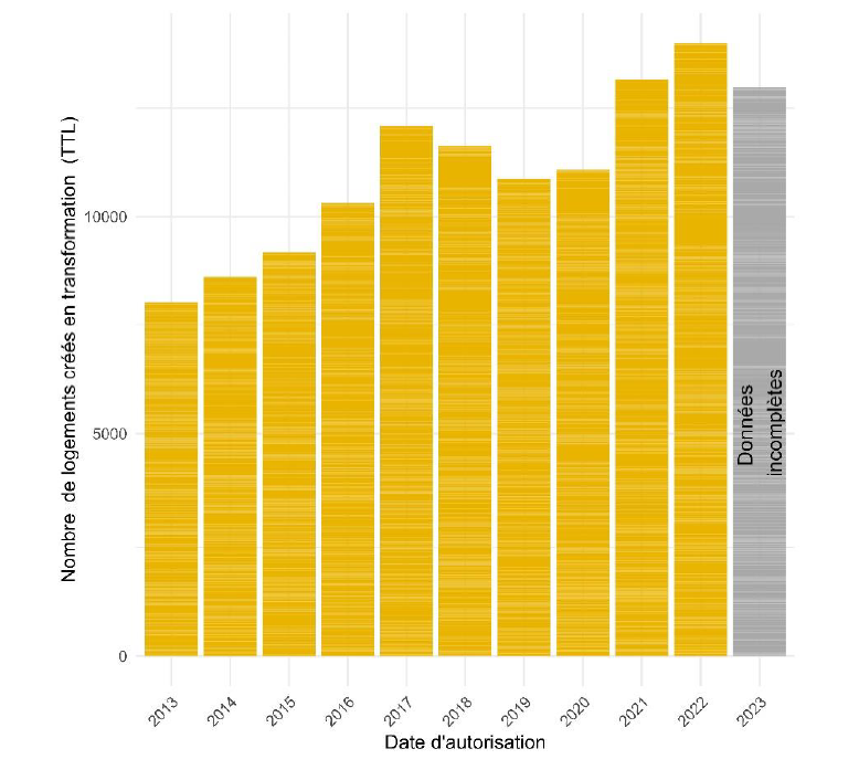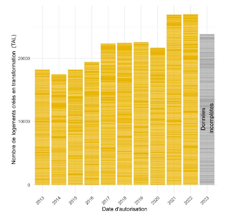 Alors qu’au début des années 2010, le nombre de logements créés annuellement par cette voie oscillait autour de 18 000 unités, il dépasse 25 000 unités en 2021 et 2022. L’année 2023, dont les données ne sont pas encore complètes, devrait afficher des niveaux au moins aussi importants confirmant cette tendance à la hausse. Ceci est d’autant plus significatif que l’ensemble de la production de logements a accusé une forte baisse sur la période, notamment entre 2017 et 2021 en France.[1]