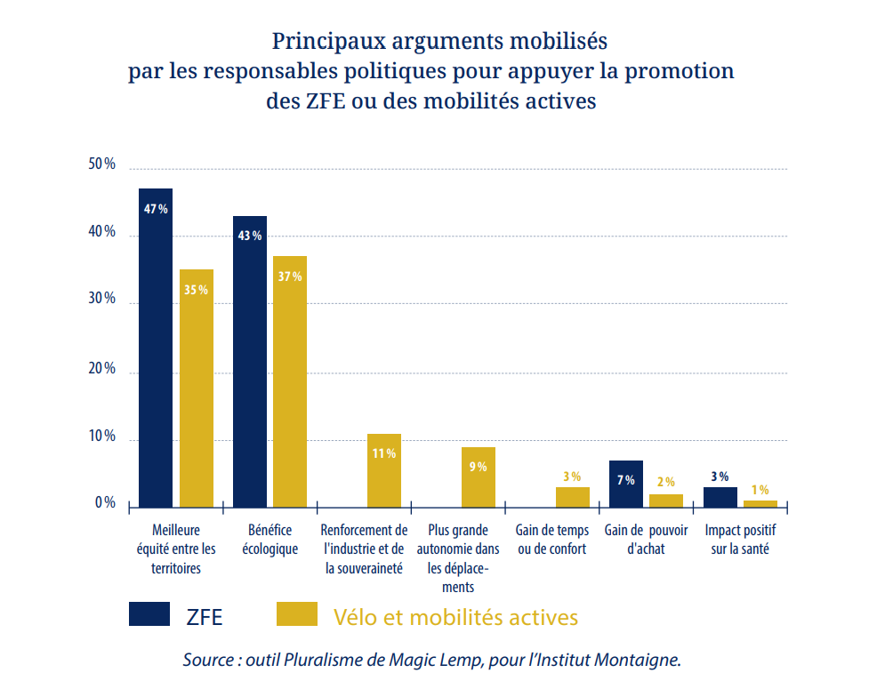 Pour les ZFE, l’argument écologique a été mobilisé quatorze fois plus que l’argument sanitaire, pourtant mieux documenté ; pour les mobilités actives, il est cité à lui seul entre deux et trois plus souvent que l’ensemble des bénéfices individuels réunis (santé, pouvoir d’achat, gain de temps et d’autonomie). Les bénéfices personnels ont été relégués au second plan.
