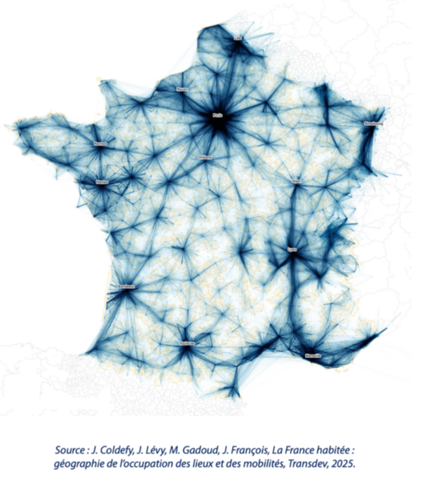 Hormis le vaste système polycentrique nantais (de l’Est d’Angers au Sud de la Vendée), la majorité des flux convergent vers les grandes métropoles régionales depuis la grande périphérie. S’y ajoutent quelques configurations en « sillons » dans le Val de Loire, l’Alsace et la Lorraine, ainsi que sur les littoraux du Sud-Bretagne et de la Côte d’Azur.