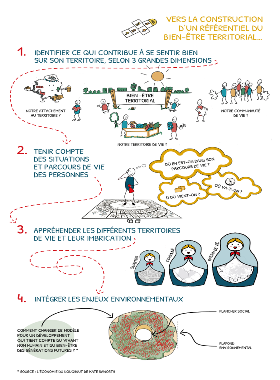 Le référentiel du bien-être territorial présente de façon graphique les différents leviers identifiés (être attaché au territoire, s’engager et s’affirmer, vivre dans un environnement sain et sécure, se former à tout âge…). Il permet de susciter les échanges au sein d’un collectif pour faire émerger une vision partagée et spécifique du bien-être territorial, et de s’accorder sur la manière dont on pourrait l’évaluer aujourd’hui et dans le temps. Il a été publié sous forme de poster « Mode d’emploi ».