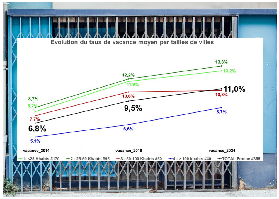 Les chiffres sont éloquents. La vacance commerciale — c’est-à-dire la part de locaux commerciaux inoccupés dans un périmètre donné — est passée en moyenne de 6,8 % à 11 % en France entre 2014 et 2024. Elle atteint même 13,8 % en moyenne dans les communes entre 25 000 et 50 000 habitants[1].