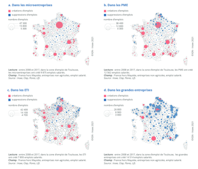 Même si les grandes entreprises, observées à périmètre constant, ont eu tendance depuis la crise de 2008 à détruire beaucoup d’emplois, en particulier dans les régions du croissant industriel historique (Normandie, Hauts-de-France, Grand Est, Bourgogne-Franche-Comté), cela n’a pas enrayé le mouvement de concentration des effectifs en leur sein. Le jeu de cartes présenté ci-dessous, issu d’une publication de l’Insee[1], propose une analyse des créations et destructions d’emplois intervenues entre 2008 et 2017 à l’échelle des zones d’emploi et selon la taille des entreprises. On constate que les soldes de créations d’emplois dans les micro-entreprises sont positifs presque partout en France, hormis les espaces de faible densité qui s’étirent le long de l’axe Meuse-Creuse. Les fragilités de l’arc nord-est apparaissent avec les destructions d’emplois qui y prédominent dans les PME et ETI, alors qu’elles sont créatrices nettes d’emplois ailleurs. La carte consacrée aux grandes entreprises est très impressionnante. Elle donne à voir des soldes négatifs dans la majeure partie de la France, mais particulièrement élevés dans l’arc industriel historique (Normandie, Hauts-de-France, Grand Est, Bourgogne-Franche-Comté). L’axe Seine, le bassin minier, le sillon lorrain, le corridor alsacien… subissent d’importantes destructions d’emplois dans les grands groupes exportateurs. On y devine les traces du creusement des déficits commerciaux français.