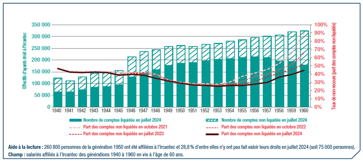 46,8 % des affiliés de la génération 1940 n’avaient pas liquidé leurs droits en juillet 2024, contre seulement 26,1 % de ceux de la génération 1954 (graphique 1). Cette forte diminution a notamment été facilitée par la mise en place, à partir de la génération 1949, du droit à l’information grâce auquel les assurés disposent de relevés de carrière et d’estimations indicatives globales de leur pension. La remontée de la part des comptes non liquidés pour les générations suivantes (1955 à 1960) tient au fait qu’une partie significative des affiliés concernés n’est pas encore partie à la retraite. En effet, les départs tardifs sont particulièrement nombreux à l’Ircantec : en 2023, plus de 15 % des nouveaux retraités ont liquidé leurs droits à 67 ans ou après. Les taux de non-recours des générations 1955 et suivantes ne sont donc pas encore stabilisés et sont appelés à diminuer dans les années à venir comme cela a été le cas pour les générations précédentes : ainsi, le taux de non-recours mesuré pour les affiliés nés en 1954 baisse de 11 points entre les mesures d’octobre 2020, date à laquelle les affiliés n’ont pas encore atteint leur 67e anniversaire, et de juillet 2024, année au cours de laquelle ils atteignent l’âge de 70 ans.