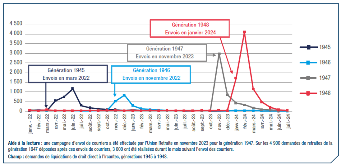 Le groupement d’intérêt public Union Retraite (l’Union Retraite) a par ailleurs conduit, avec l’aide des différents régimes de retraite, des campagnes d’envois de courriers auprès des assurés en situation de non-recours. Les générations 1945 à 1948 ont chacune été ciblées pour faire l’objet d’une campagne d’envois de courriers entre mars 2022 et janvier 2024. Pour ces quatre générations, plus de 18 000 demandes de retraite ont suivi les quelques 70 000 courriers envoyés aux affiliés disposant de droits non liquidés à l’Ircantec. Certaines liquidations restent certainement à prévoir pour les générations 1947 et 1948 dont les envois sont encore récents (respectivement novembre 2023 et janvier 2024), mais cela restera sans doute marginal. En effet, les demandes de liquidations suivent de manière très rapprochée l’envoi des courriers. À titre d’exemple, sur les 4 900 demandes de retraites de la génération 1947 effectuées entre novembre 2023 et juillet 2024, 4 600 (soit 93 % des demandes) ont été réalisées durant les 4 mois suivants l’envoi des courriers (graphique 2).