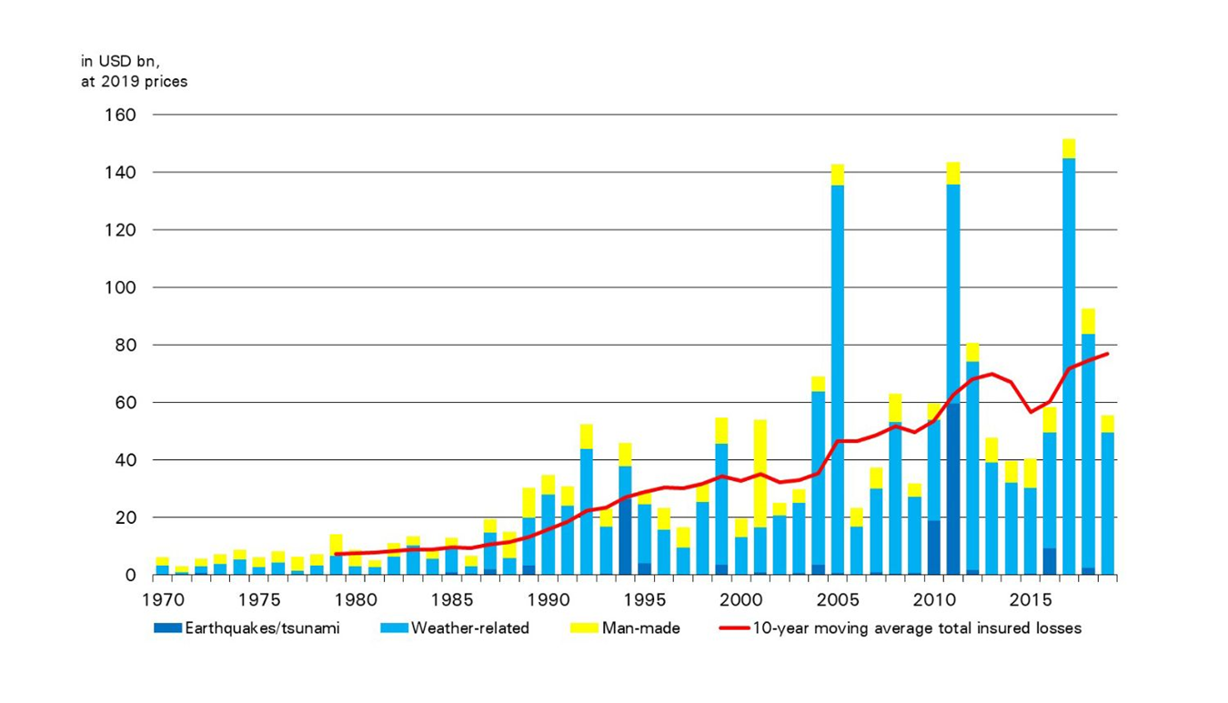 A l’échelle mondiale, les pertes financières liées aux catastrophes naturelles se sont élevées à 250 milliards de dollars en 2023. Toujours en 2023, un nombre record de pertes assurées dues aux conditions météorologiques extrêmes a dépassé pour plus d’un milliard de dollars.