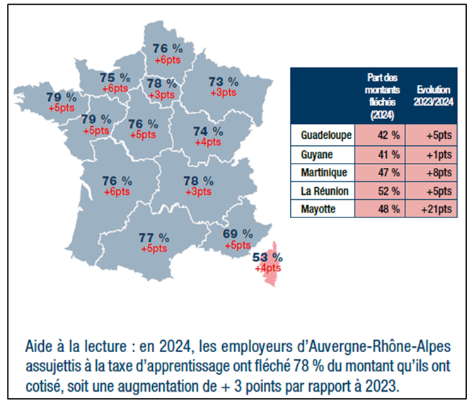 En 2024, 1,4 million d’employeurs sont redevables de la taxe d’apprentissage. Parmi eux, près de 700 000 (48 %) ont fléché des crédits aux établissements habilités de leur choix pour un montant total de 378 millions d’euros. Ce montant représente 76 % du montant total cotisé, soit 4 points de plus qu’en 2023. Cette part est plus faible en Corse et dans les DROM que dans les régions métropolitaines (carte 1).