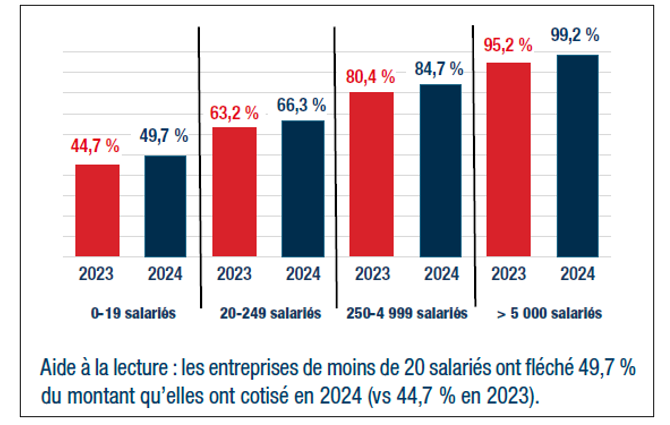 La part du solde de TA faisant l’objet d’un fléchage s’échelonne, en 2024, de 50 % pour la catégorie des entreprises de moins de 20 salariés à 99 % pour celle des entreprises de 5 000 salariés et plus (graphique 1).