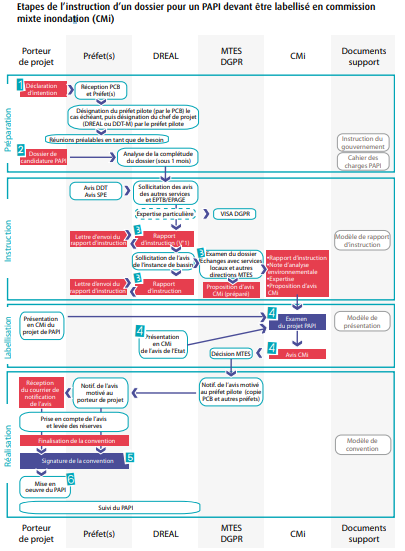 On relève ainsi, à côté du porteur du projet (l’intercommunalité, la métropole, ou le syndicat mixte qui en est le délégué), le préfet en charge de la validation des différents documents répondant au cahier des charges de la prévention, les représentants de la Direction régionale de l’Environnement, de l’Aménagement et du Logement (DREAL) et la Direction générale de la prévention des risques du Ministère de la Transition écologique (DGPR/ MTES), enfin la Commission Mixte Inondation en charge de la labellisation définitive.
